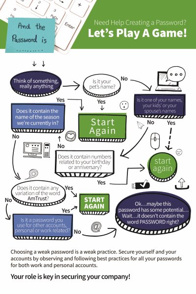 It’s always tempting to create a password using a loved one’s name, a pet’s name, a birthday or anniversary and so on. However, these types of passwords are generally quite easy for a hacker to figure out. Instead, passwords should be at least 12 characters long and include upper and lower case letters, numbers and symbols.